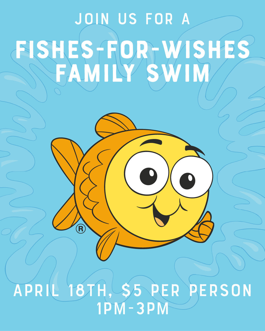 Wishes are waiting. Please help support this great cause by joining us on April 18th open Family Swim from 1pm to 3pm or by making a donation to our “Fishes for Wishes” fundraising campaign. This event will be $5 per person with all proceeds going to Make-A-Wish! Thank you for your support!